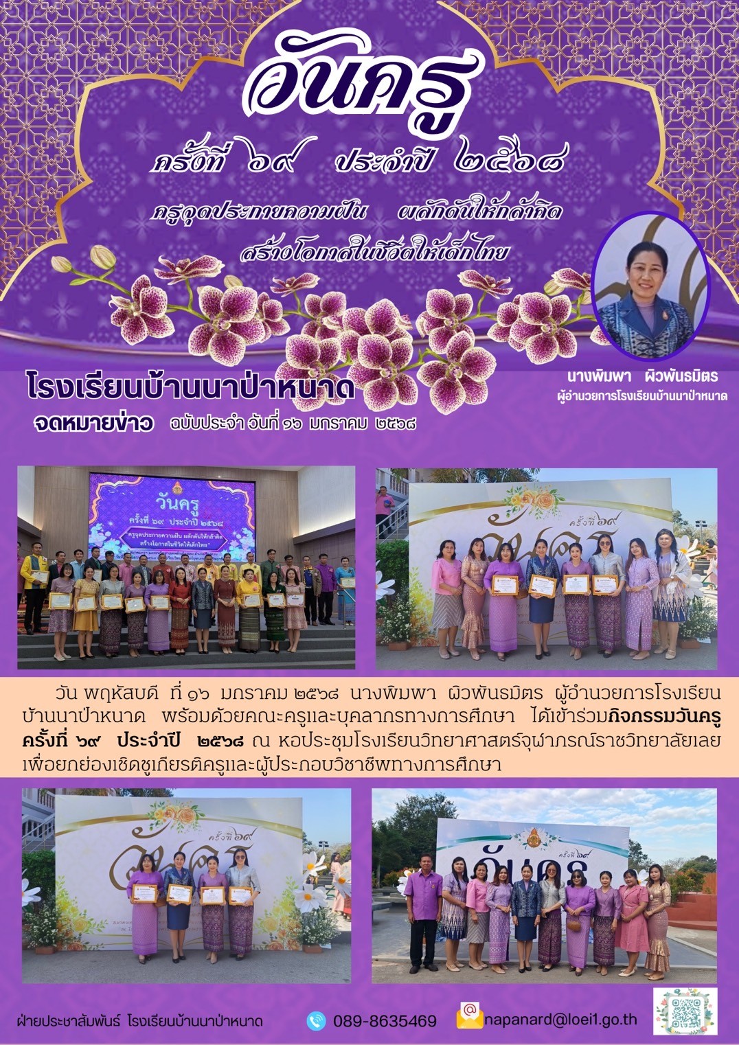 วัน พฤหัสบดี ที่ ๑๖ มกราคม ๒๕๖๘ นางพิมพา ผิวพันธมิตร ผู้อำนวยการโรงเรียน บ้านนาป่าหนาด พร้อมด้วยคณะครูและบุคลากรทางการศึกษา ได้เข้าร่วมกิจกรรมวันครู ครั้งที่ ๖๙ ประจำปี ๒๕๖๘ ณ หอประชุมโรงเรียนวิทยาศาสตร์จุฬาภรณ์ราชวิทยาลัยเลย เพื่อยกย่องเชิดชูเกียรติครูและผู้ประกอบวิชาชีพทางการศึกษา